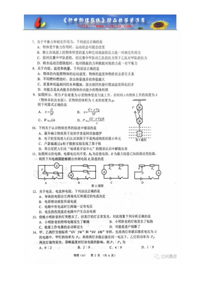 甘肃省兰州市2017年中考物理试题(图片版,含答案)