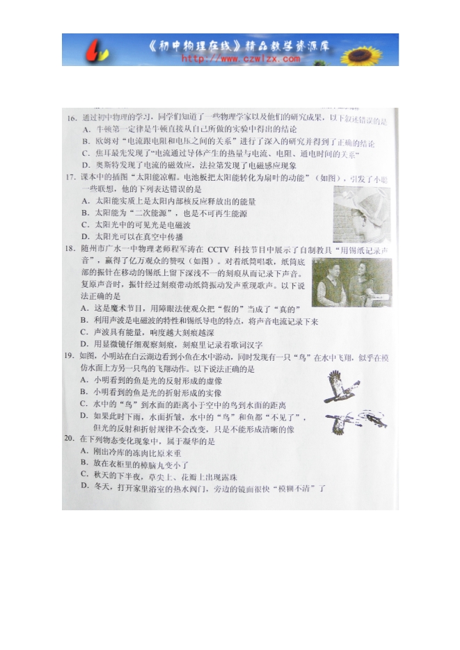 湖北省随州市2017年中考理综(物理部分)试题(图片版,含答案)