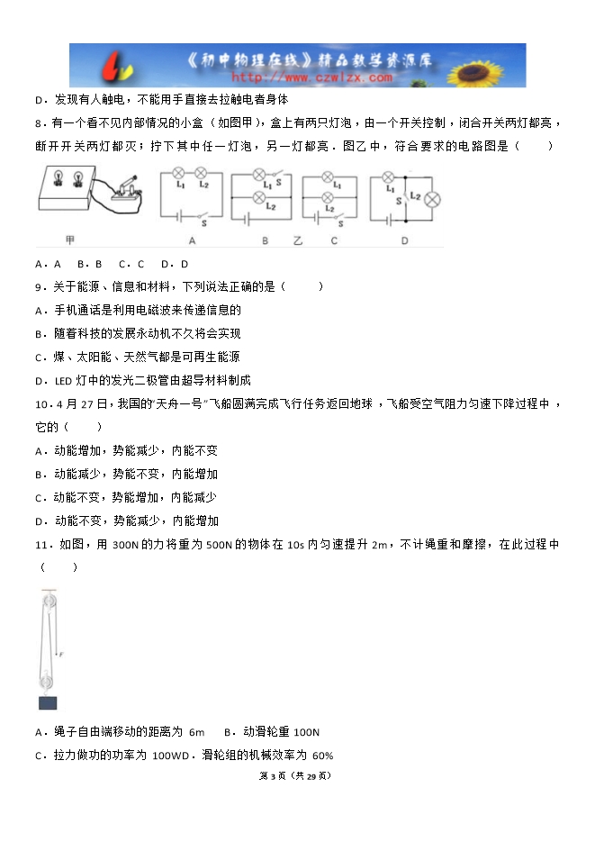 - 上一份试卷:2017年湖南省衡阳市中考物理试卷(解析版)