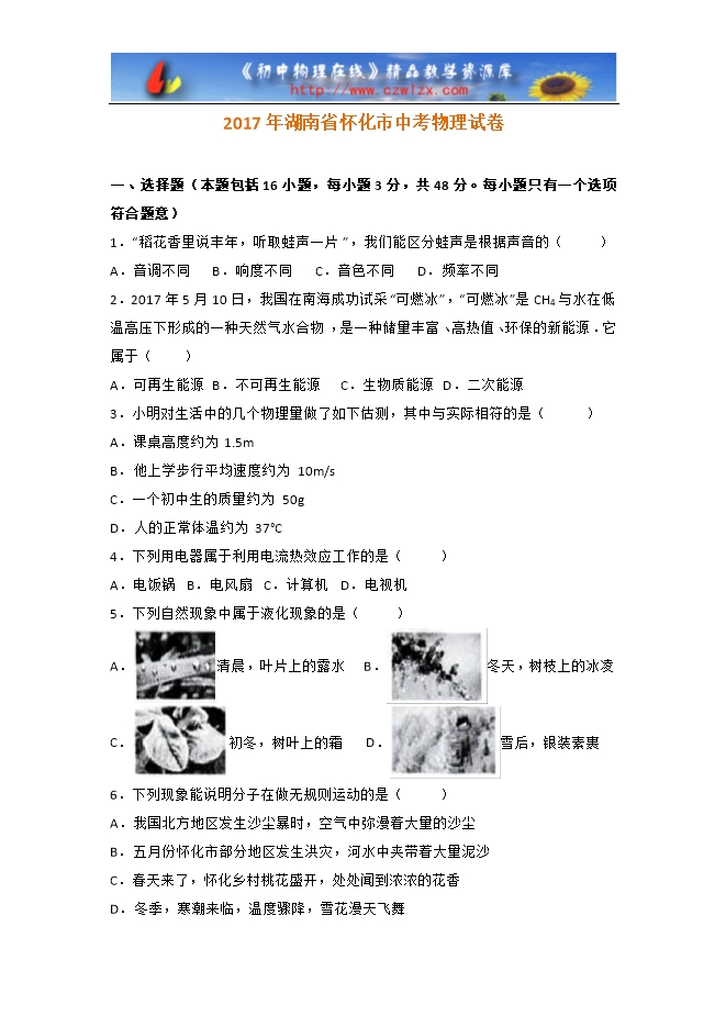 湖南省怀化市2017年中考物理试题(word版,含解析)