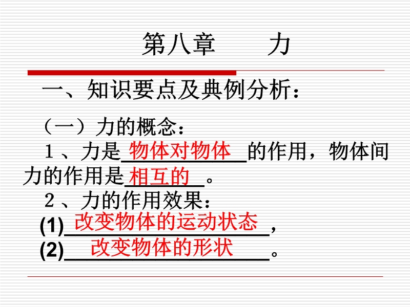课件内容:展示了力的概念、力的图示、重力的概念及与质量的关系、二力的合成、精选了9道典型例题。