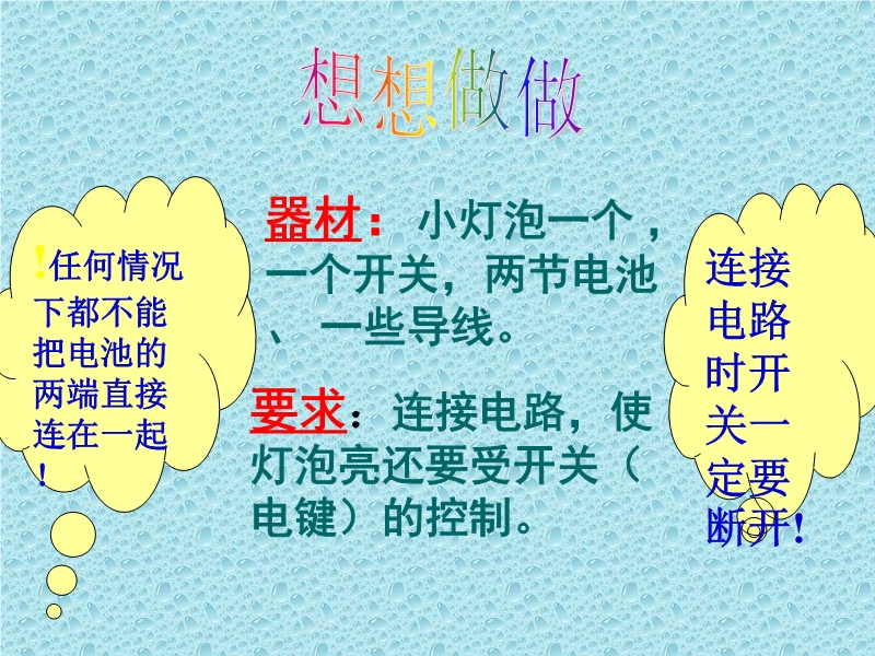 课件内容:以20张幻灯片分别对电流和电路的连接、要注意的地方等方面进行详细的讲解,并针对本课的重点内容进行练习,注重了学生能力的培养。课件用Powerpoint平台制作,没有打包,所以用户还可以根据自己的特点加以修改和补充,也可以直接用于多媒体课堂教学中。
