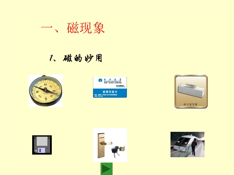 - 121[精品]2021秋北师大版九年级物理ppt课件和素材:14.4.1《电磁铁及其应用--磁现象》PPT课件+素材