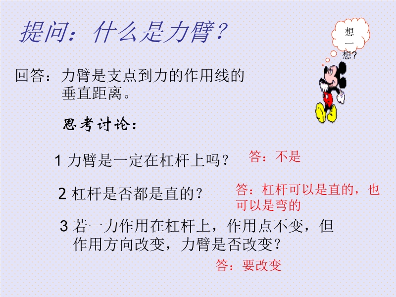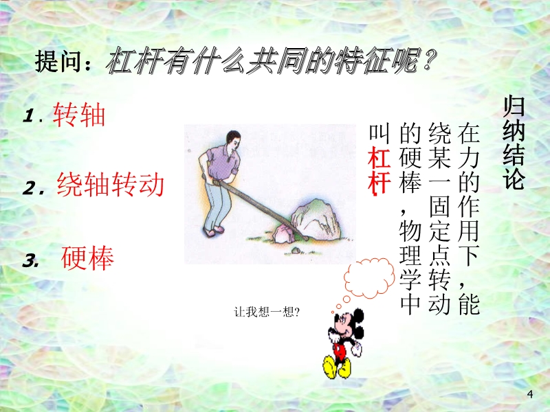 【内容简介】本课件制作了有关杠杆的新课教学过程,内容主要包括杠杆的概念、有关杠杆的几个名词、杠杆的应用、杠杆的平衡条件等,共有19张幻灯片。教学过程设计合理、科学,重点突出,能抓住关键突破难点,能启发学生积极进行思考、讨论问题,并把物理与生活联系起来。课件制作新颖、交互性强,操作方便,可供教学“杠杆”时参考使用。