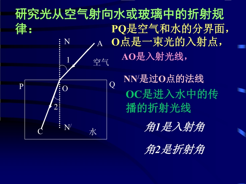 【内容简介】本课件引导学生通过实验认识了光从空气射入水时或玻璃中时发生的现象,并由此总结了光的折射规律,以作图的形式认识了光路的可逆性。课件内还精选了习题,可供课堂教学时参考使用。