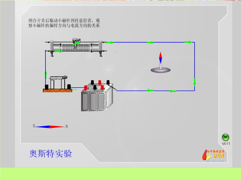 【内容简介】本课件主要引导学生探究了电流产生磁场的现象、通电螺线管的磁场和安培定则等。课件制作独特,插入了flash动画演示,使课件更生动、形象,也有利于解决难点、强化重点,有利于培养学生的能力。