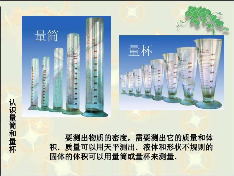 【内容简介】本课件引导学生探究了量筒(量杯)的使用及用量筒和天平测量物质密度的方法,教学过程设计科学、合理,重点突出,能提高学生的兴趣,培养学生的能力。