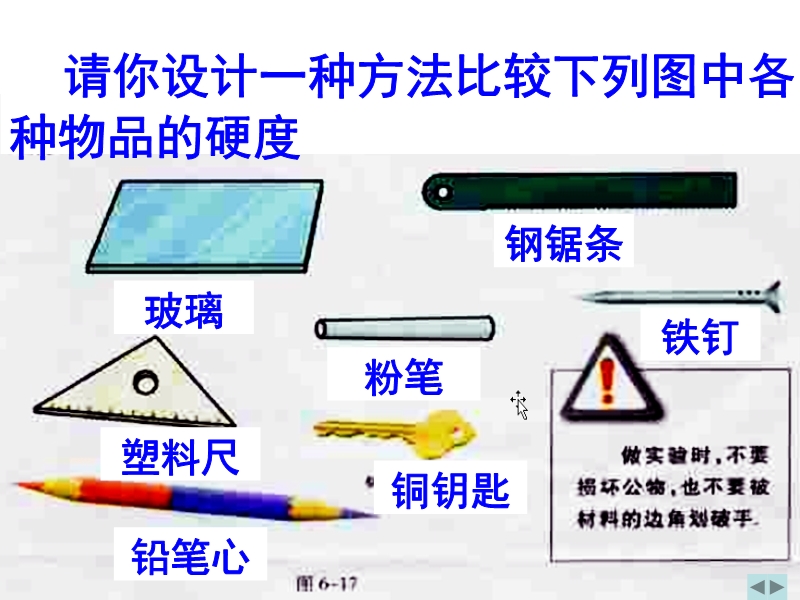 本课件可用于亮度较小的投影仪,动画效果好,内容丰富多彩,重点突出,使用方便,用本课件上课不需要使用黑板。教学内容充分联系生产和生活实际,并切合学生的认知要求。安排的内容很多,不要做学生实验,比较硬度的实验不做。使用时要先熟悉部分超链接。