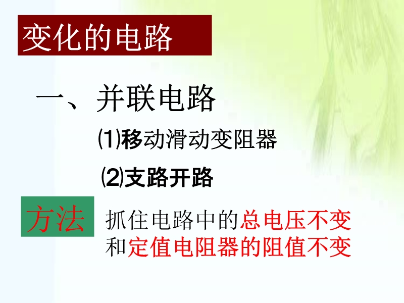 【内容简介】课件共20张幻灯片和8个flash组成,对串联电路和并联电路的总电阻发生变化时,电表如何变化,为突破难点每个例题有理论分析和flash展示,另课件6道还配有2008年中考试题.