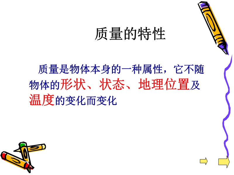 【内容简介】人教版《11.2质量》ppt课件由28张幻灯片组成,本课件包含了对质量含义的理解和质量是物质的一种属性。质量的单位及其换算、测量工具的使用。对托盘天平的使用用形象的动画演示非常形象。典型的相应练习。