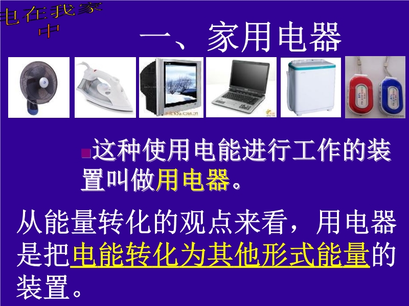 【内容简介】本课件以苏科版新教材第十三章第一节为基础制作,共有54张幻灯片,插入了一个flash动画。课件向学生展示了常用的家用电器、开关、电源、导线,并讨论了电器、电源在工作时的能量转化情况,课件引导学生通过实际操作探究了如何连接电路、讨论了连接电路时的注意事项。课件还向学生展示了基本的电路元件符号,引导学生学会画电路图。教学设计新颖、能及时进行练习,动画生动。