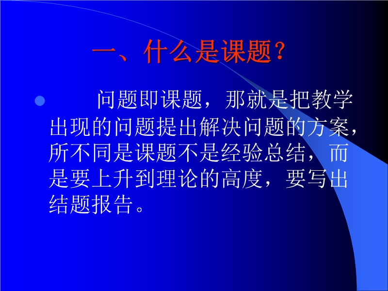 【内容简介】《课题研究专题讲座》ppt课件是在课题研究会上专题讲座,就课题研究的有关问题进行了较全面的论述,对初涉教学课题研究的人有一定的指导作用。