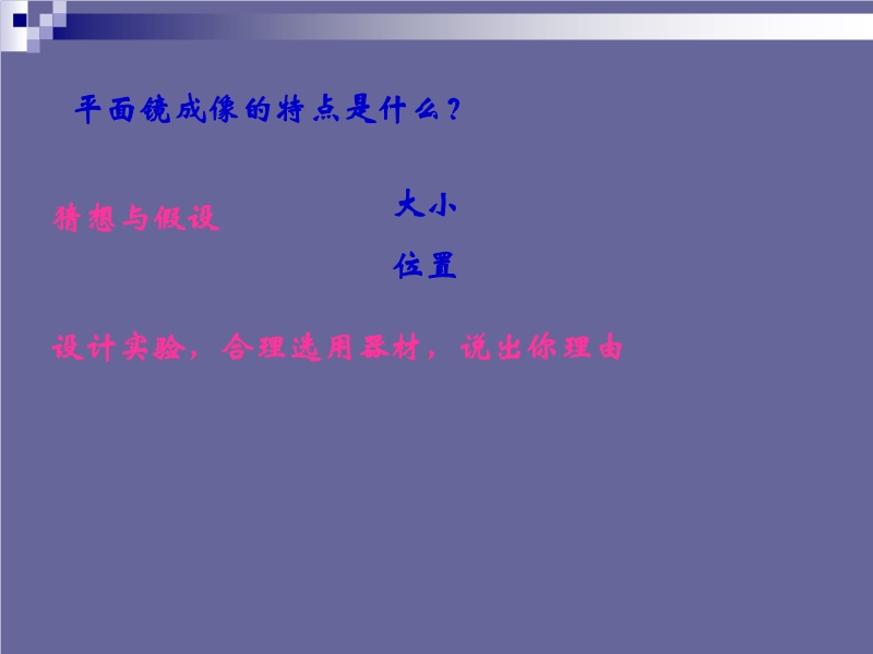 【内容简介】本课件以沪科版新教材第四章第二节为基础制作,共有16张幻灯片。课件主要引导学生探究了平面镜成像的特点,以作图的形式引导学生理解了平面镜成像的原理,教学设计理念新颖,能引导学生通过探究的方式自主地学习。课件还向学生展示了平面镜成像在日常生活的重要应用,精选了习题可供课堂教学时参考选用。