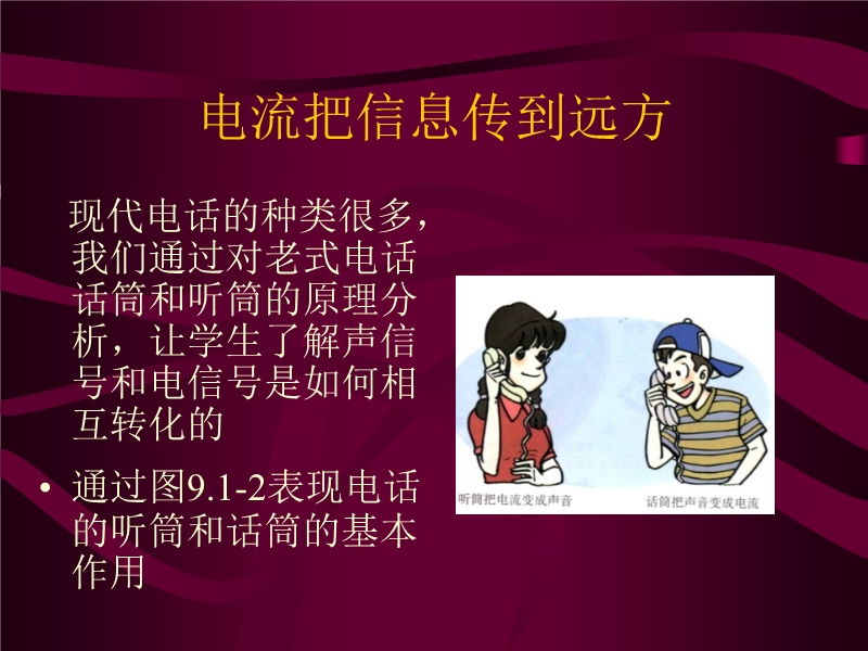 【内容简介】本课件主要介绍和分析了人教版新教材第十章的内容和教材体系,介绍了课程标准的基本要求,介绍了电话通信的原理和发展,介绍了人类对电磁波的应用,介绍了广播、电视和移动通信,介绍了卫星通信和网络通信等,内容全面,分析详细,并且介绍了教材中有关的探究活动,可供教师备课时参考使用。