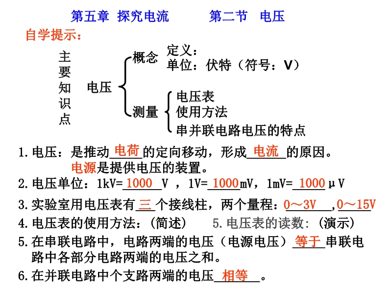 【内容简介】本课件是教科版 初中物理 九年级 5.2电压:电流产生的原因,内含练习电压表读数的flash动画,有完整的教学过程,包括课上自学提示,认识电压,测量电压,探究串并联电路电压的规律,课上练习等内容。配合探究实验可以用两个课时完成。
