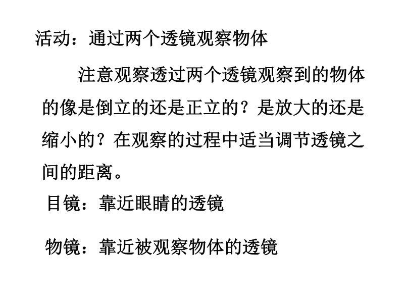 【内容简介】本课件以苏科版新教材第四章第五节为基础制作,共有19张幻灯片。课件引导学生探究了望远镜和显微镜的原理,展示了望远镜的发展,从早期的伽利略望远镜到现在的数码望远镜,展示了开普勒空间望远镜及数字式空间望远镜,课件还展示了显微镜的发展,有教学用生物显微镜、实体显微镜、手术显微镜等。课件制作独特,具体,可供教学“望远镜和显微镜”时参考使用。