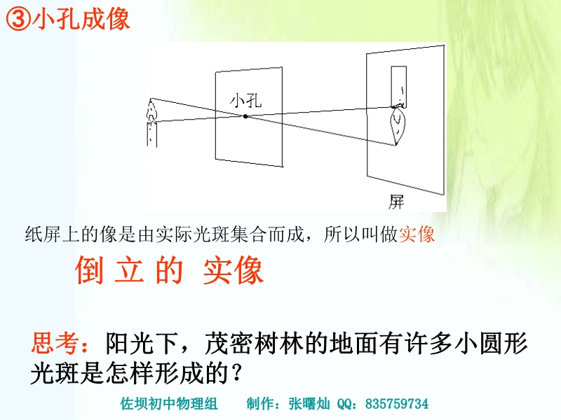 【内容简介】课件根据新人教版光学的教材编写,课件有35张幻灯片和4个嵌入式的flash组成,内容涉及光的直线传播和光的反射,主要通过动画再现知识的形成过程。课件的特点:动画交互性强,图片清晰,内容完整,此外课件还精选了大量近几年考试题并列出中考考点内容。