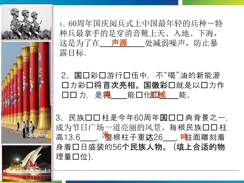 【内容简介】课件属于2010年中考复习系列课件-2010中考物理新闻热点题,课件共29张幻灯片组成,对2009年和近期国际、中国所发生的大事:“60周年国庆、台风莫拉克、低温冰雪 、日全食、日环食天象 甲型H1N1流感防控”等从物理的角度考察学生。