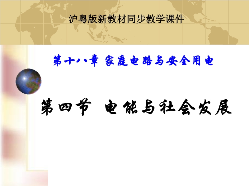 【内容简介】本课件以沪粤版新教材第十八章第四节为基础制作,共有37张幻灯片。课件以精彩的图片展示了电能的来源及电能的输送,并以大量的事实引导学生讨论了如何节约用电,措施较详细、具体,与生活密切相关,学生容易理解和掌握。本课件可供教学“电能与社会发展”时参考使用。