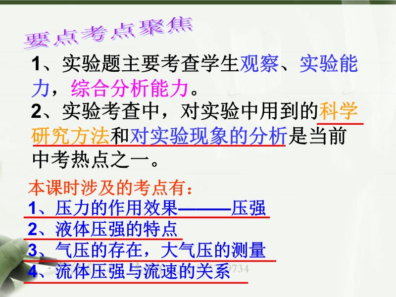 【内容简介】课件根据新人教版《压强》制作,课件共30张幻灯片组成,重点引导学生对压强一张所有试验的复习,课件制作精美、实用,值得借鉴。