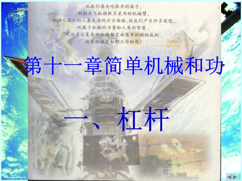 。共有35张幻灯片,课件中介绍杠杆五要素和画力臂的方法通过动画逐步展开,课件中有例题和习题,作图精确到位,图像清晰,每片都有上、下片的超链接,演示非常方便。