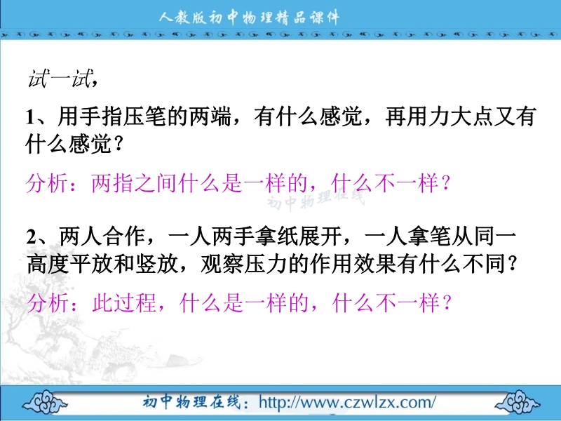 - 上一份课件:人教版《14.1压强》flash课件(旧)