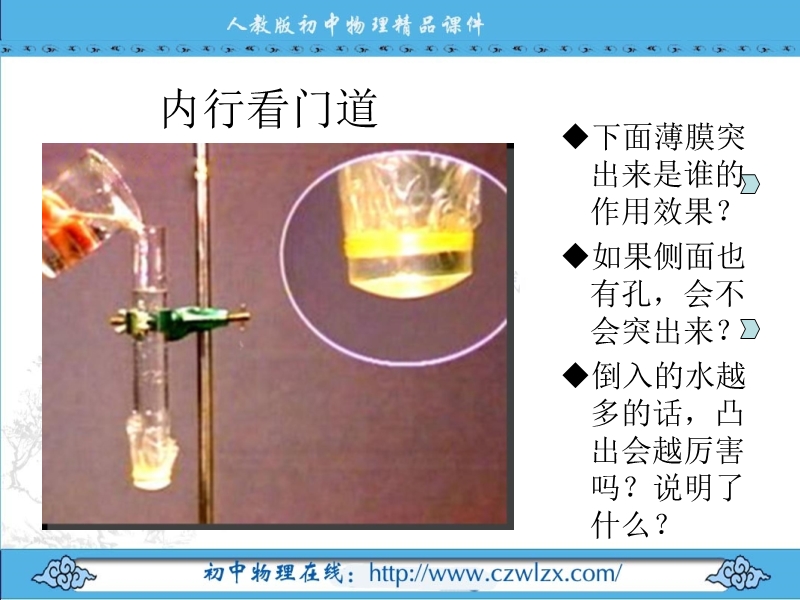 【内容简介】本课件以人教版为基础制作,共有23张幻灯片,插入了flash文件。课件主要引导学生认识了液体压强的存在,重点引导学生探究了液体压强的特点,并用该压强计探究了液体的压强与深度、密度的关系,探究了液体的压强的特点等。