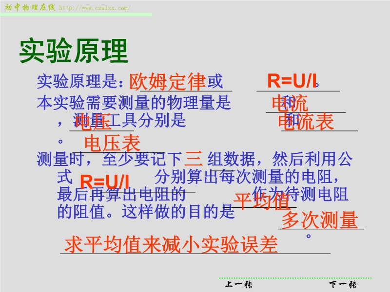 【内容简介】本课件以北师大版新教材第十二章第二节为基础制作,共有13张幻灯片。主要引导学生讨论了如何利用欧姆定律测量导体的电阻,即伏安法测电阻。课件设计思路清晰,值得借鉴。