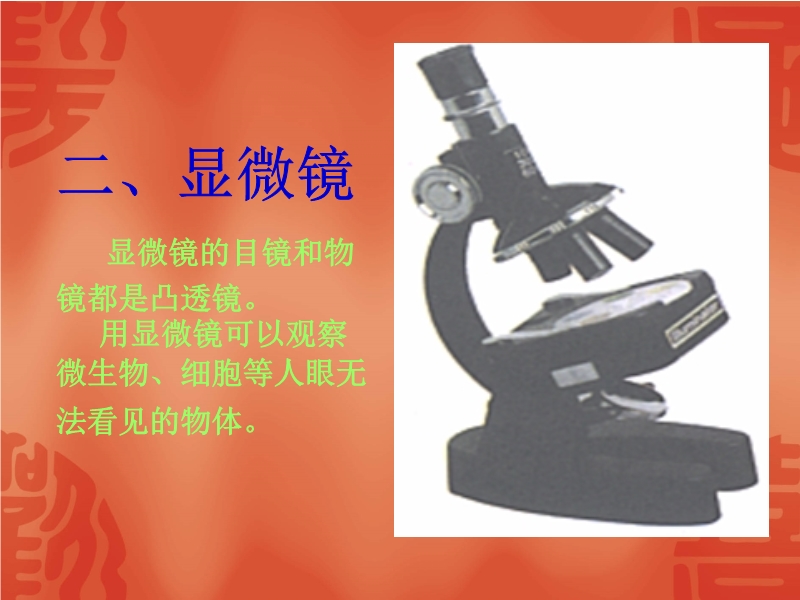 【内容简介】本课件以沪科版新教材第四章第七节为基础制作,共有19张幻灯片。课件引导学生认识了放大镜、显微镜、望远镜、照相机、投影仪的成像原理,展示了显微镜、望远镜、投影仪的基本构造,课件制作图片清晰,能更好地解决教学中的难点,帮助学生理解。本课件可供教学“显微镜、望远镜、投影仪”时参考使用。