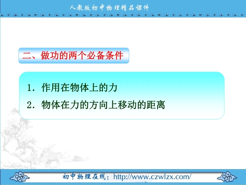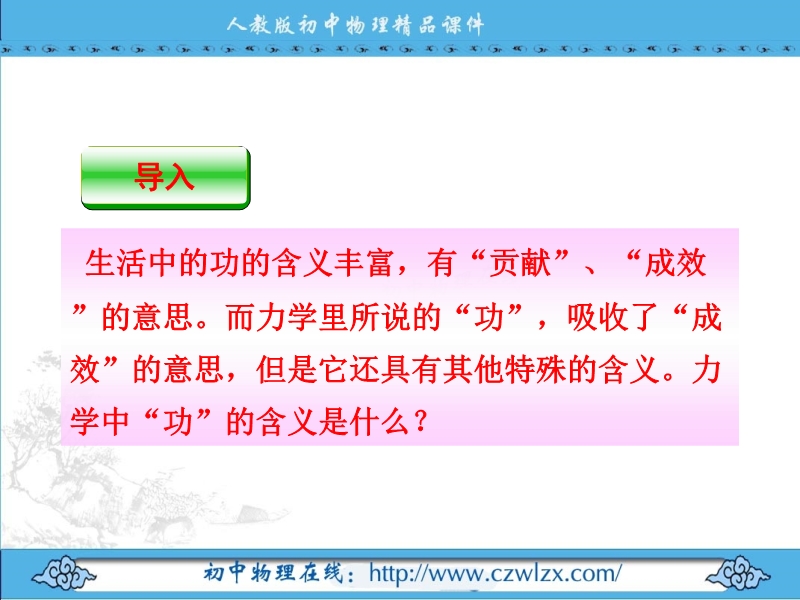 【内容简介】本课件以人教版版教材第十五章第一节为基础制作,共有20张幻灯片,并插入了大量图片。课件通过具体的实例引导学生讨论了做功的概念及做功的基本要素,学习了功的计算、功的单位,课件中还精选了例题和习题。