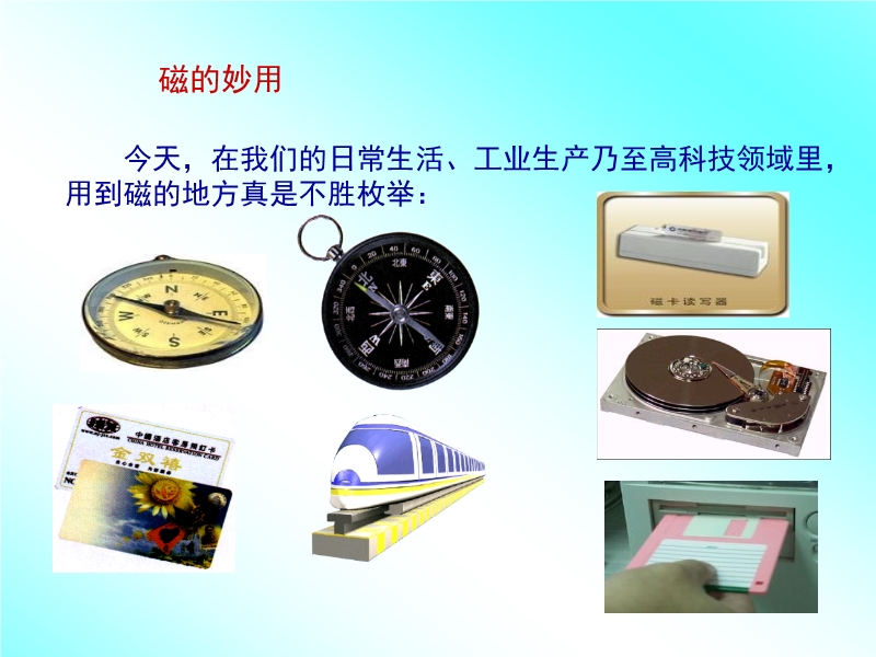 【内容简介】本课件以沪科版新教材第十章第一节为基础制作 ,共有24张幻灯片,并插入了一个视频文件。课件首先展示了磁在生活中的重要应用,然后引导学生认识了简单的磁现象,认识了磁性、磁体、磁极、磁化、去磁的概念,探究了磁极间的相互作用,磁体的磁性分布。课件用视频展示 了小磁针在条形磁体周围的指向情况,引入了磁场的概念,展示了各种形状的磁体的磁场分布情况等 ,引导学生讨论了磁感线的意义,展示了地磁场的分布等 。课件中还有习题可供课堂练习使用。