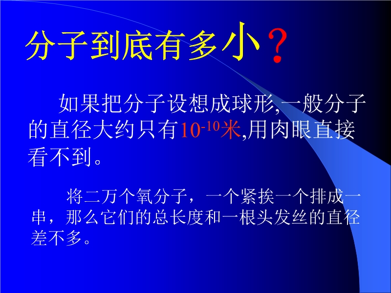 【内容简介】本课件以人教版新教材第十章第一节为基础制作,共有28张幻灯片。引导学生认识了分子的概念、分子的大小,通过实验展示了物质的扩散现象,展示了气体、液体、固体的扩散现象,让学生认识了分子之间存在间隙并且分子在不停地运动,引导学生设计实验探究了扩散快慢与温度的关系,从宏观上认识了分子运动快慢与温度的关系,展示了分子之间存在引力和斥力。课件制作生动,教学内容充实、具体,可供教学“分子热运动”时参考使用。