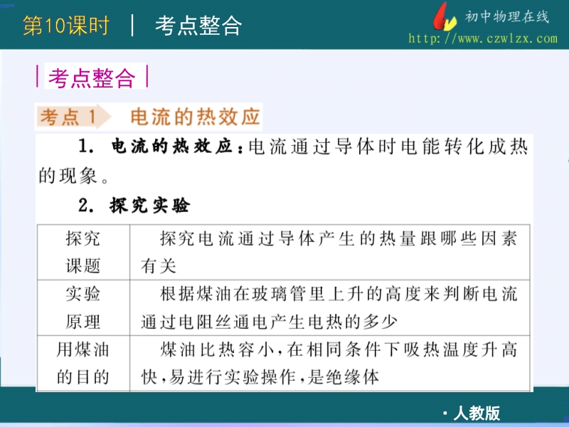 【内容简介】本课件共有19张幻灯片。主要引导学生复习了电流的热效应、焦耳定律及应用、电热与电能的关系,电热的利用和防止等,重点引导学生培养学生的解决问题,熟悉中考考查问题的方式,因而课件对每一个知识点借用了2010年中考试题,并有详细的解答分析,课件供2011年中考复习使用!