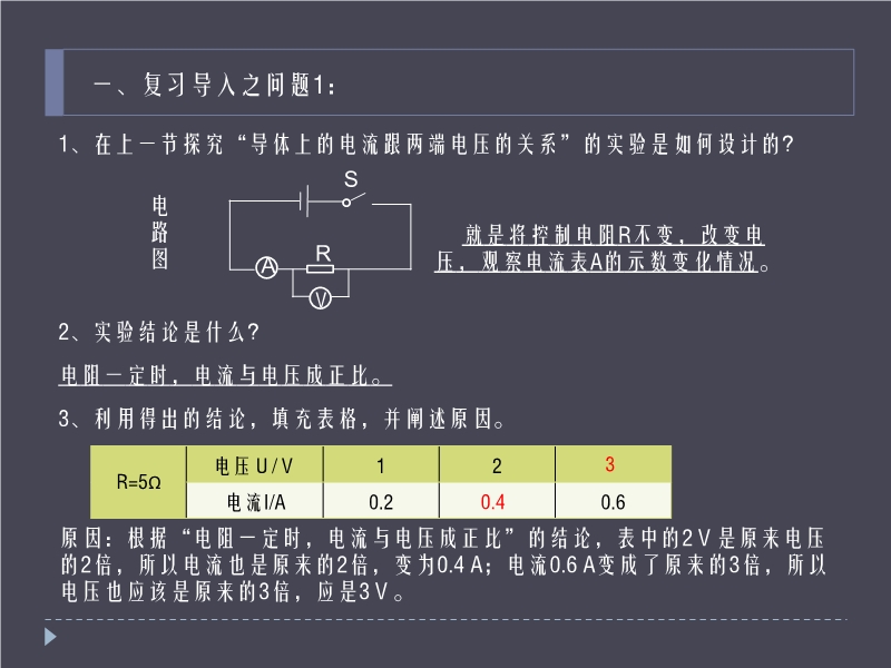 【内容简介】课件来源于乌鲁木齐106学校,共12张幻灯片。本课件主要引导学生复习了欧姆定律的内容和表达式及其变形公式,课件的重点通过典型的例题引导学生应用欧姆定律解决简单的实际问题、掌握解题的方法和技巧等,重在培养学生的应用能力。
