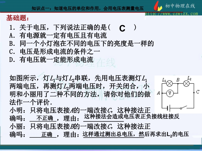知识点1:知道电压的单位和作用,会用电压表测量电压;
