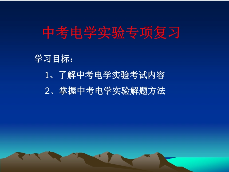 【内容简介】课件为2011年中考复习准备而制作,课件展示的内容:1、了解中考电学实验考试内容 2、掌握中考电学实验解题方法,课件制作的思路:以2010年中考试题为背景,组织学生对初中电学实验的复习。