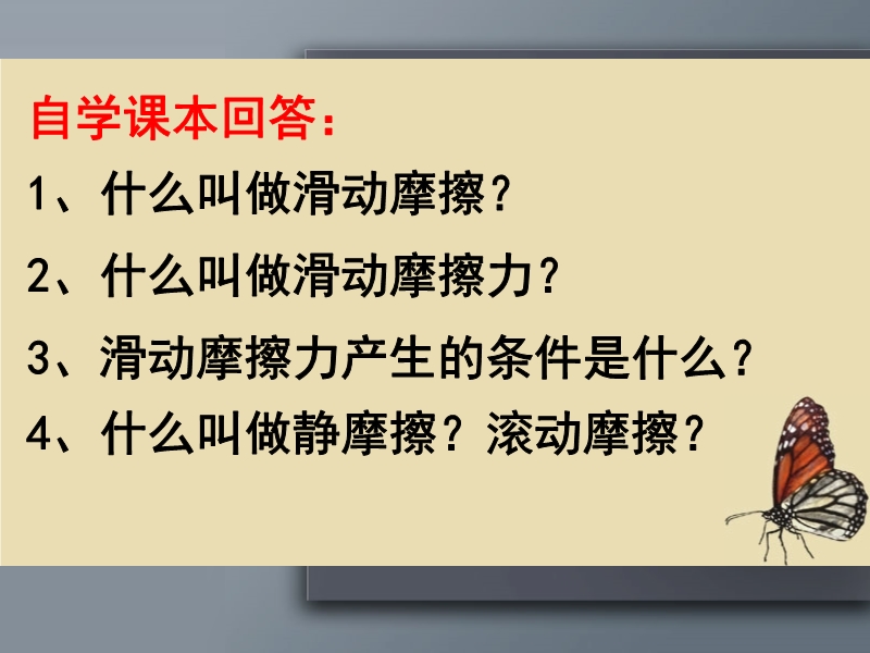 【内容简介】本课件以北师大版新教材第七章第六节为基础制作,共有26张幻灯片。课件引导学生认识了三种摩擦,展示了生活中的摩擦现象,讨论了摩擦产生的原因,重点引导学生通过实验探究了摩擦力的大小与哪些因素有关,让学生经历基本的探究过程,有猜想与假设、设计实验、进行实验、收集数据、分析与论证等,最后总结了摩擦力与压力大小及接触面的粗糙程度的关系。课件还引导学生讨论了如何增大摩擦和减小摩擦,与生活联系密切。本课件可供教学“摩擦”时参考使用。