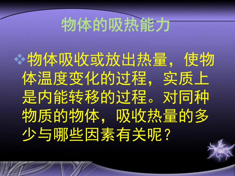 本课件以教科版新教材九年级第一章第三节为基础制作,共有19张幻灯片。课件从物体的吸热能力上引导学生了解比热容的概念。通过实验探究比较不同物质的吸热能力来理解比容意义及单位和计算,并引导学生应用比热容的知识解释生活中的一些现象。