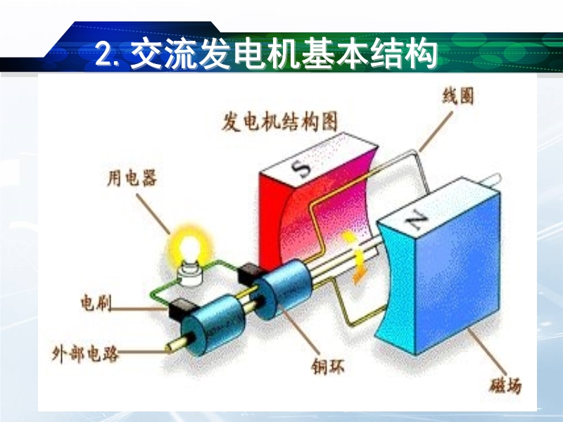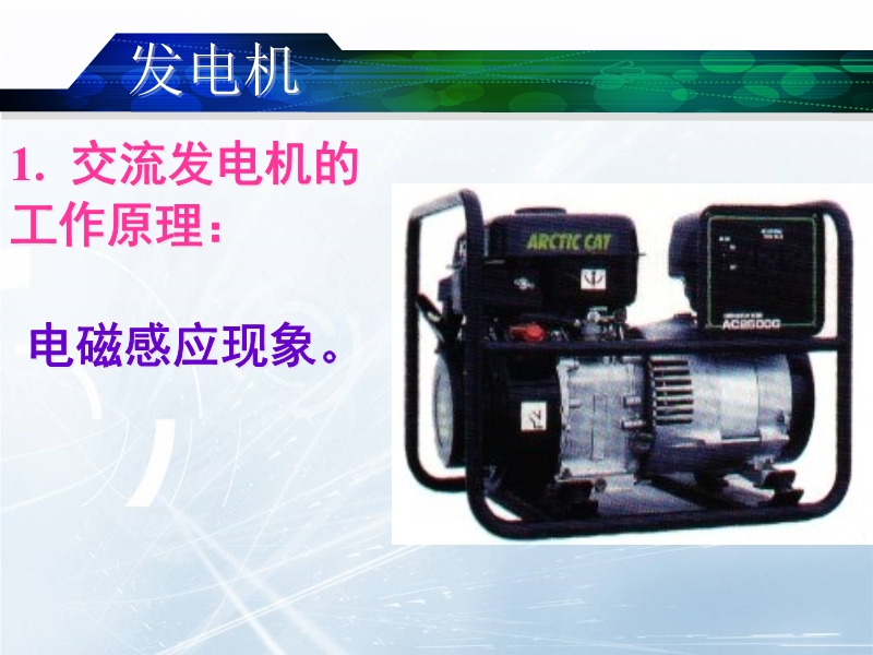 【内容简介】本课件以人教版新教材第九章第七节为基础制作,共有26张幻灯片,并插入了一个flash动画。课件展示了交流发电机的基本结构,并展示了实际的交流发电机,引导学生认识了它的构造,讨论了它的原理,还用flash动画模拟演示了交流发电机的工作过程及发电原理,让学生对交流电有了初步的了解和认识,课件还展示了大型的发电厂的发电机组等。本课件可供教学“发电机”时参考使用。