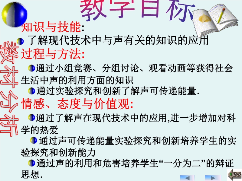 【内容简介】该说课共15张幻灯片,说课的课件内容涉及:教材分析、学情分析、目标分析、教程分析 、教法学法、评价分析等方面。课件从6个方面进行了详细的阐述,分析每个环节的设计理念,达到的目的和不足之处。该说课课件的上课课件“人教版《1.5声的利用》PPT+视频课件”在初中物理在线网站可以下载。