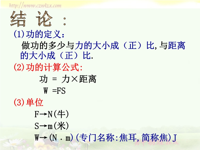 【内容简介】本课件以人教版新教材第十五章第一节为基础制作,共有19张幻灯片内嵌1个flash动画。课件通过具体的四个生活中的实例,引导学生找出共同点,在此基础上学习了做功的概念、功的意义、功的单位,并讨论了做功 的两个必要因素,课件的最后还引导学生认识了机械功的原理。课件还精选了典型的例题和习题,供教学参考使用!