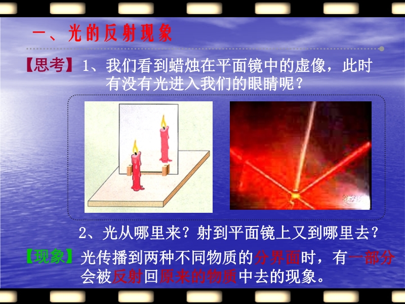 【内容简介】本课件以苏科版新教材第三章第五节为基础制作,共有20张幻灯片,并插入了两个flash动画。课件展示了光的反射现象,引导学生设计实验探究了光的反射规律,展示了反射规律在生活中的应用,如平面镜、潜望镜、角反射器等;课件还展示了两种反射,分析了它们的特点。课件还展示了凸面镜和凹面镜的应用等。本课件可供教学“光的反射”时参考使用。