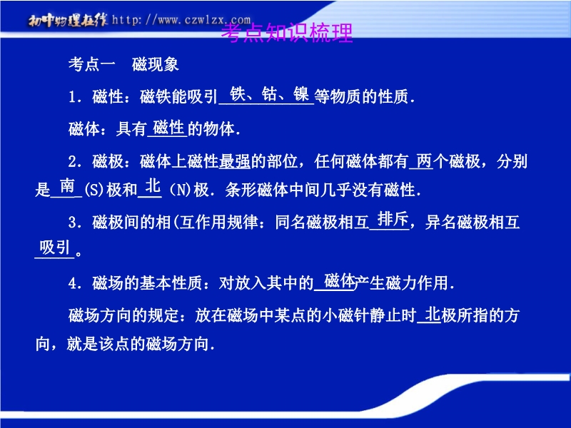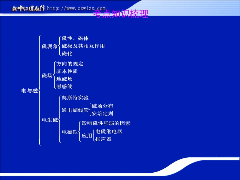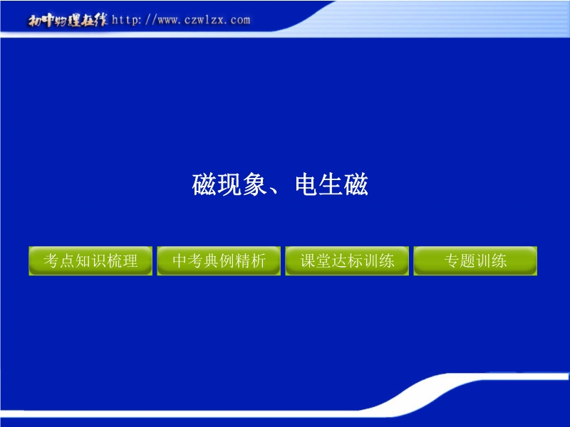 【内容简介】本课件为2012年中考复习制作,共有46张幻灯片。课件复习的内容是电学知识点:磁现象、电生磁。课件采用四个模块:“考点知识梳理 中考典例精析 课堂达标训练 专题训练”,课件注重对知识的构造,通过中考中考典例精析突破知识的重点和难点,课堂达标训练培养学生的运用知识的能力,课件每道中考试题都有点评和答案,课件讲究实效,是中考复习中的精品课件。