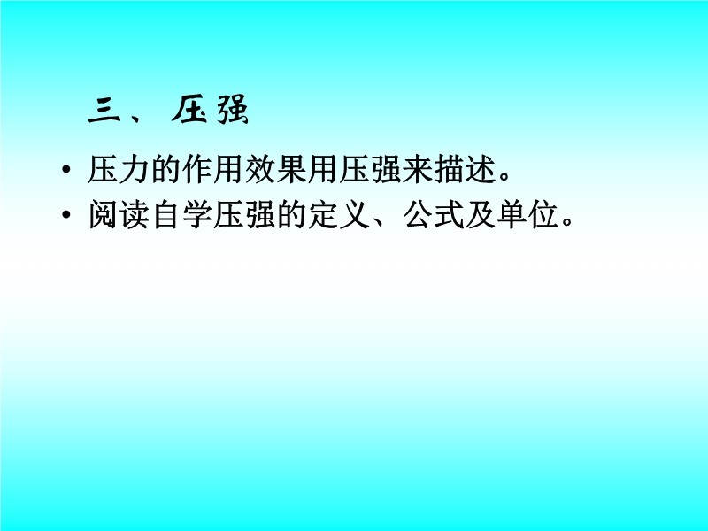【内容简介】本课件以苏科版新教材第十章第一节为基础制作,共有18张幻灯片。课件主要引导学生认识了压力,比较了压力与重力的区别,探究了压力的作用效果与哪些因素有关,引入了压强的概念,讨论了压强的意义、压强的计算,并引导学生联系生活实际认识了压强与生活的关系,讨论了如何增大压强和减小压强等。