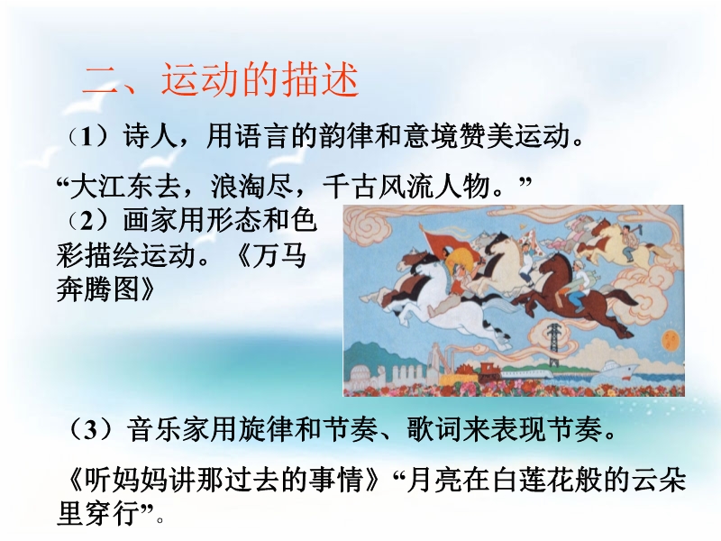 【内容简介】本课件以沪科版新教材第二章第一节为基础制作,共有32张幻灯片,并插入了一个flash动画。课件首先展示了飞机空中加油、飞行员抓子弹、太阳系中天体的运动,让学生对运动有初步的认识,然后展示了运动的不同描述方法,在此基础上引出了物理学描述运动的方法,让学生认识了什么是机械运动,课件精选了典型的事例引导学生分析机械运动的判断及参照物的选取问题,最后引导学生讨论了运动与静止的相对性。本课件可供教学“机械运动”时参考使用。