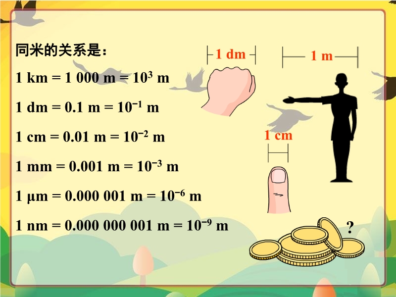 【内容简介】本课件以新人教版新教材第一章第一节为基础制作,共有45张幻灯片。课件引导学生学习了长度的单位及换算、展示了测量长度的一些工具、讨论了刻度尺的正确使用方法,还学习了一些特殊测量的方法,引认识了误差的概念及减小误差的基本方法、学习了时间的单位及其测量工具等。
