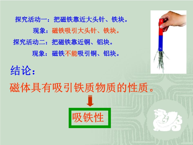 【内容简介】本课件以沪科版新教材第十六章第一节为基础制作,共有18张幻灯片,并插入了两个flash动画和两个视频。课件引导学生认识了磁的应用,通过小实验探究了磁体的性质、磁极间的相互作用、磁化的概念。课件还引导学生认识了磁场的概念,磁场的特点,讨论了磁感线的作用等。本课件可供教学“磁现象”时参考使用。