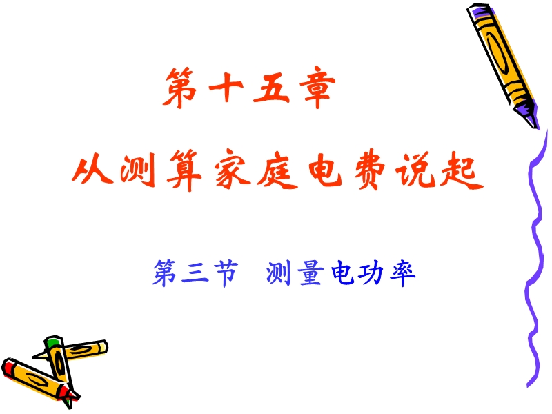 【内容简介】本课件以沪科版新教材第十五章第三节《15.3测量电功率》为基础制作,共有19张幻灯片和3个flash动画。课件探究了如何测量小灯泡的电功率,实验目的、实验原理、实验电路图的设计、实验器材的选择、实验数据的记录及实验电路的连接等,课件还引导学生分析了实验数据,总结结论等。课件通过动画演示实验的过程化解教学的难点。