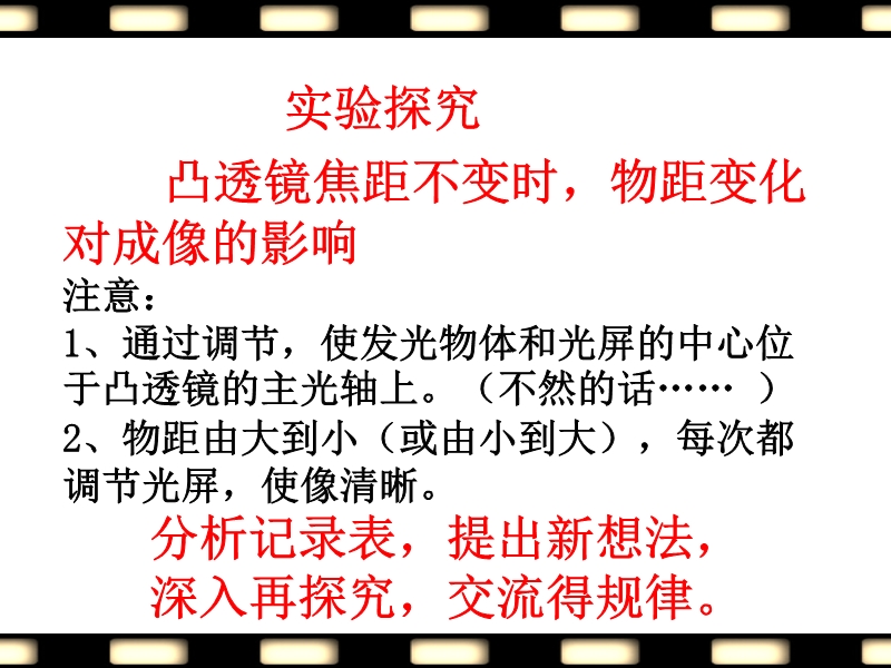 【内容简介】本课件以苏科版新教材第四章第三节为基础制作,共有34张幻灯片,并插入了四个flash动画和一个视频。课件首先引导学生观察凸透镜能成像,然后引导学生猜想成像的特点,并引导学生设计实验方案进行了探究,并用flash动画作了模拟演示实验,总结了凸透镜成像的特点,讨论了成像原理等。本课件可供教学“凸透镜成像”时参考使用。