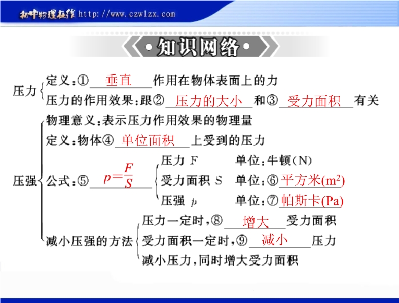 【内容简介】课件为2013年中考复习制作,课件共22张幻灯片,课件首先总结归纳了《第八章 神奇的压强》的知识点,形成网络结构,课件将重、难点采用讲练结合的方法进行突破,课件重在对学生的能力的提高,精选了2012年中考部分试题,依照现行的考纲进行设计教学。 课件注重对学生的基础复习,设计合理、科学,值得借鉴。
